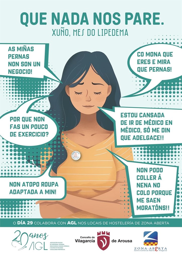 «Nos alegra comentaros que mañana, en Vilagarcía de Arousa, presentaremos una exposición que visibiliza el Lipedema, a las 13h en la Plaza de Galicia, que además va acompañada de la colaboración de la Asociación de Comerciantes ZonaAberta de Vilagarcía, donde 9 comercios tendrán en sus escaparates, maniquís con lipedema.